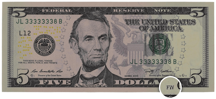 一張在德克薩斯州沃思堡印製的2009年5美元紙幣