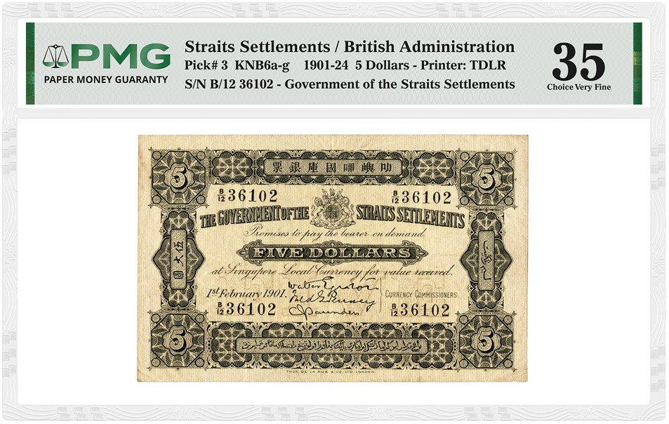在亮相本場拍賣會的PMG評級鈔中,一張英屬海峽殖民地1901-1924年叻嶼呷國庫銀票伍大圓尤為搶眼。其評級等級為PMG 35 Choice Very Fine(拍品號1482),估價為1.6萬至3萬馬來西亞林吉特(約合3,900至7,400美元)。1901年愛德華七世繼位英國君主後,在海峽殖民地發行新版紙幣,首次引入了更小的面額,其中便包括這張伍大圓紙幣。1901年伍大圓是愛德華七世在位時期最早發行的一批海峽殖民地紙幣,如今已成為同類別紙幣中的熱門珍品。